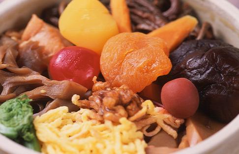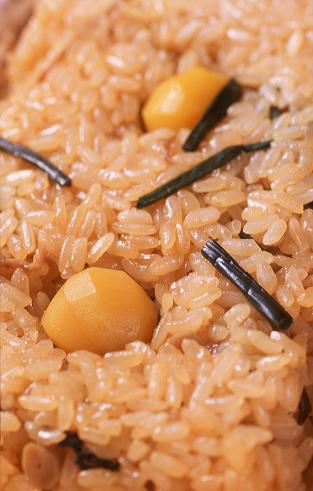 栗おこわ弁当 原田泰治さんの山里風景のイラストが描かれた外装の中からは、竹の皮に包まれた素朴な感じのお弁当が出てきた。今時竹の皮を使ったお弁当などめったに見ることはできないので、これだけでもうれしい気分にさせられる。使われているおこわは越後産の良質米のため、つぶつぶ感ともちもち感は最高だ。ついつい箸が進む。わらび、キクラゲ、たけのこなどの山菜をお醤油味で炊き込まれており、彩りもさわやか。それになんと言っても大きな小布施の栗がでんでんとのっかっているところが、シンプルな上にも存在感がある。ほんのりと甘く味付けされた栗はすぐに食べてしまうにはもったいないような優雅な味わい。副菜は一口昆布巻き、ぜんまい煮、ごぼう煮、それに北アルプス山麓で育てられた野沢なのわさび漬けのぴりっとした味が全体を引き締めている。竹の皮の香りがご飯に移り、しょうゆの風味とともに香ばしい味わいを楽しめる。 |