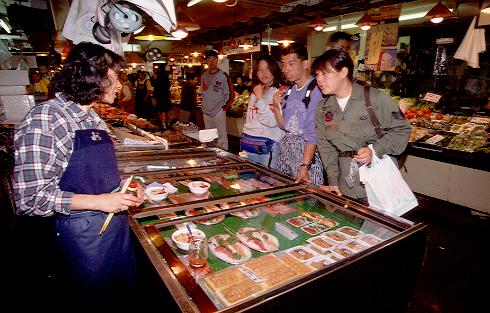 ●"具"選びは真剣そのもの(和商市場) これを楽しみに釧路に来たという若者たち。好きな刺身を思いっきりてんこ盛りにしてもらって、ご満悦。 |