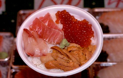 | ●お好きなものをトッピング(和商市場) もう見ているだけでもよだれが出そうな、超新鮮な海鮮丼。市場内でご飯を買い、予算に合わせてトッピングを購入。口の中でとろけてしまうその味わいは空前絶後。 |