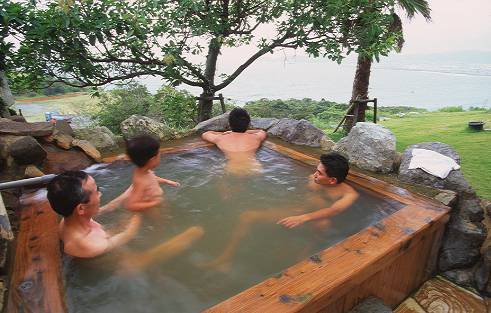 | ●高台の露天風呂『なぎさ温泉』 枕崎市内を見渡せる高台にあり、抜群のロケーションを誇る。特に露天風呂は、東シナ海や立神岩を眺められ、最高の気分を味わえること間違いなしだ。 |