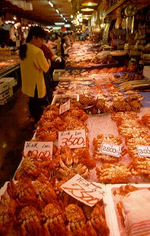 ●ずらっと並んだかにの数々(和商市場)市民の台所「和商」と呼ばれて広く親しまれている釧路和商協同組合は、昭和29年に結成された釧路で最も歴史ある市場だ。「買ってきな、まけとくよ」笑顔が弾ける気さくな対面販売はこの市場の持ち味で、試食を勧められるままぱくり。花咲がにの濃厚の味わいは、もうこらえられない。 |