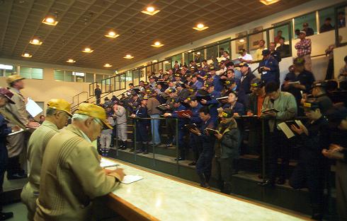 ●釧路水産センター、セリ風景 競り自体はものの十五分ほどで終わった。欲しいところで「ハッ」と大声を上げる。一番に声をあげた人に権利がある。真剣そのもの。何を言っているのか分からないが、あっという間に決まって行く。いきなり皆が会場を出ていった。それを見て「あー終わったんだな」と気が付く始末だ。 |