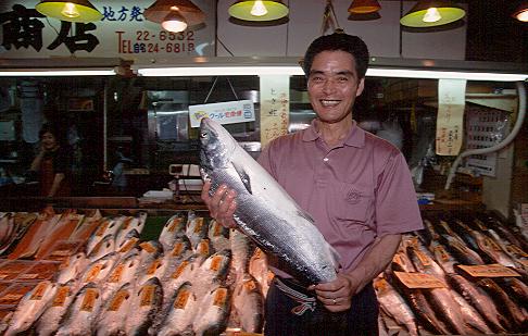 ●脂の乗ったときしらず(和商市場)7月半ば頃まで釧路沖でとれる"トキシラズ"これを食べずして鮭を語るなかれ、と言いたくなるほどのうまさ。脂ののりぐらいは最高で、是非塩をふる前の生のものを焼いて食べたい。 |